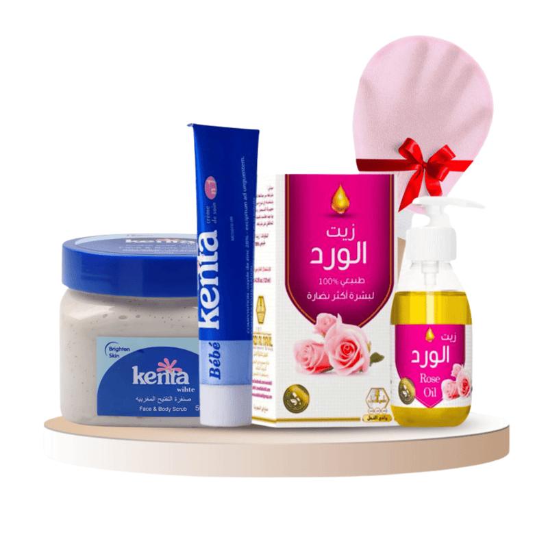 الباقة تجمع بين مفعول زيت الورد الطبيعي، كريم كينتا بتركيبته الفريدة، والصنفرة الناعمة اللي تعزز إشراقة البشرة وتوحّد اللون.