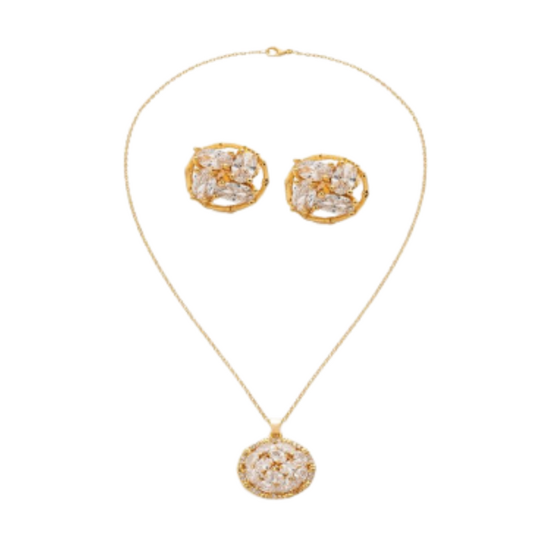 يتميز الطقم بتصميمه الأنيق بحليه بشكل دائري مفرغ تتزين بفصوص من الزركون اللامع