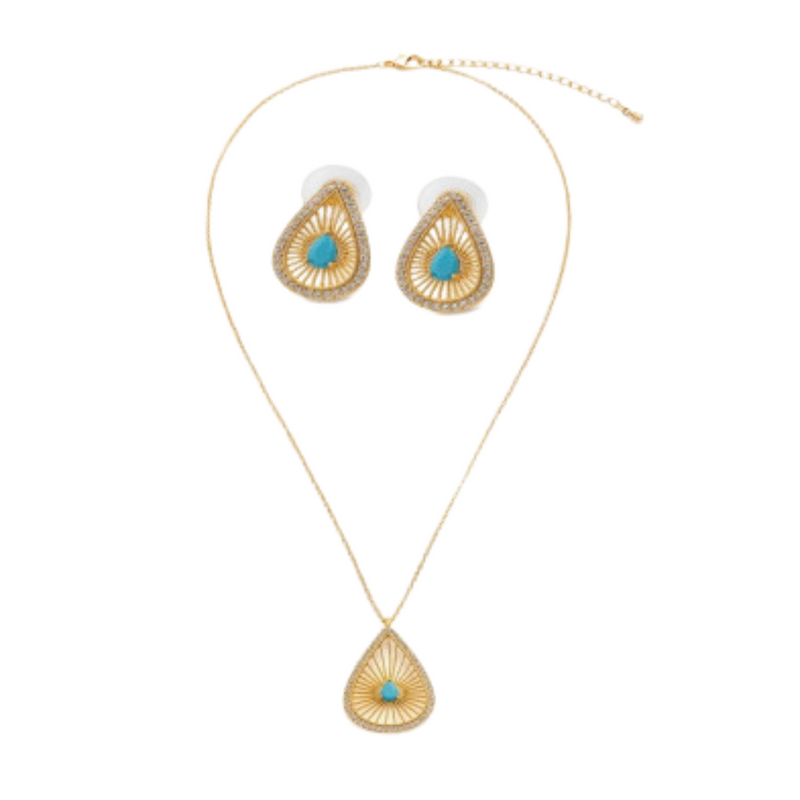 سلسال وحلق بتصميم حلية بشكل دمعة بلون زرق مرصعة بفصوص الزركون البراقة تضفي لمسة من الجاذبية