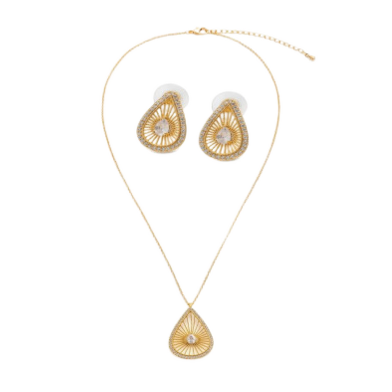 سلسال وحلق بتصميم حلية بشكل دمعة بلون فضي مرصعة بفصوص الزركون البراقة تضفي لمسة من الجاذبية
