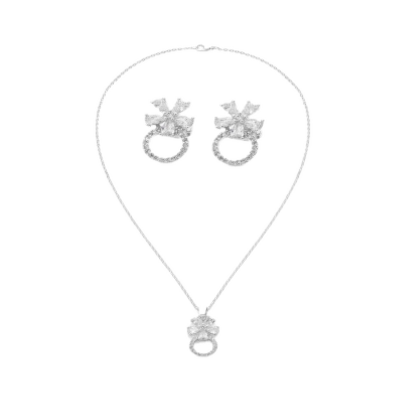 يتميز الطقم بتصميمه الأنيق بحليه مفرغة بشكل دائري تتزين بفصوص من الزركون اللامع وتتزين بحلية بشكل وردة