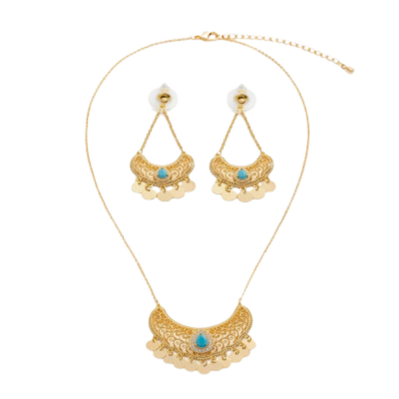 يتميز الطقم بتصميم حلية بشكل مميز مرصعة بفصوص الزركون البراقة بلون أزرق تضفي لمسة من الجاذبية