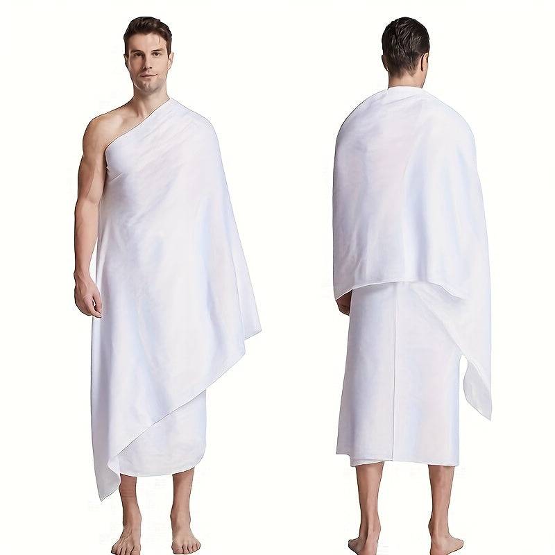 ٢ قطع من مناشف الإحرام للرجال – بيضاء، بجودة عالية ٣٥٠ جرام لكل متر مربع، مصنوعة من البوليستر الفاخر، ناعمة جدًا ومتينة – المقاس: ١٠٩.٢٢ × ٢٠٨.٢٨ سم – قابلة للغسيل في الغسالة