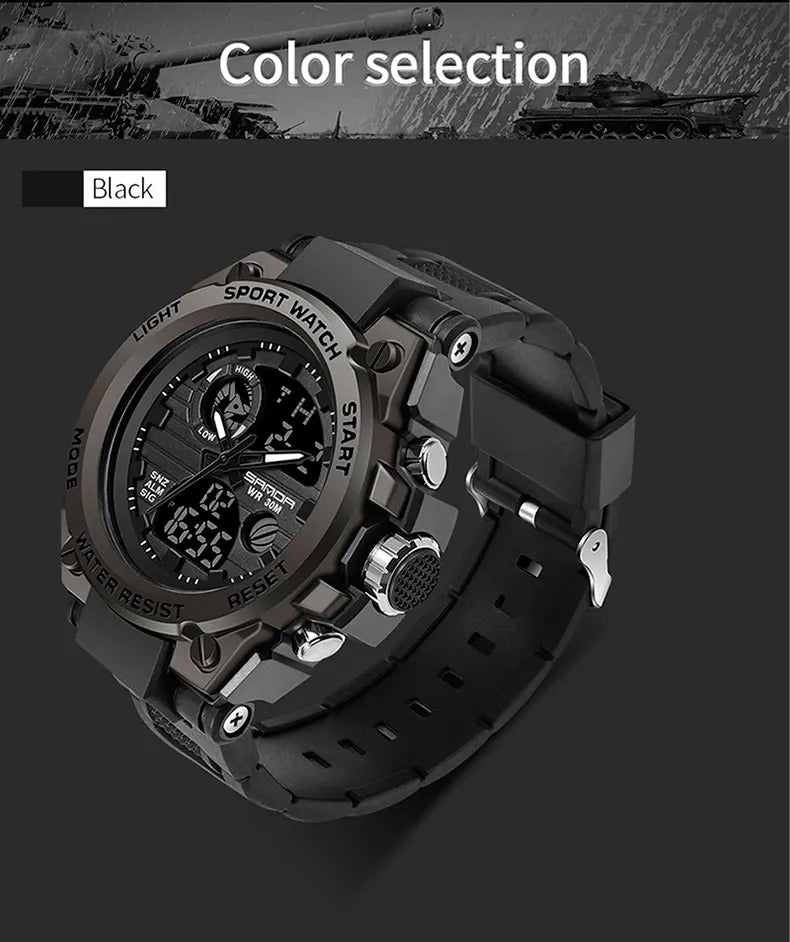 ساعة ساندا SANDA الرياضية للرجال بتجمع بين التصميم القوي والأداء العملي. بتقدم مظهر رياضي أنيق مع مميزات متعددة تناسب الاستخدام اليومي والتمارين وحتى المغامرات.